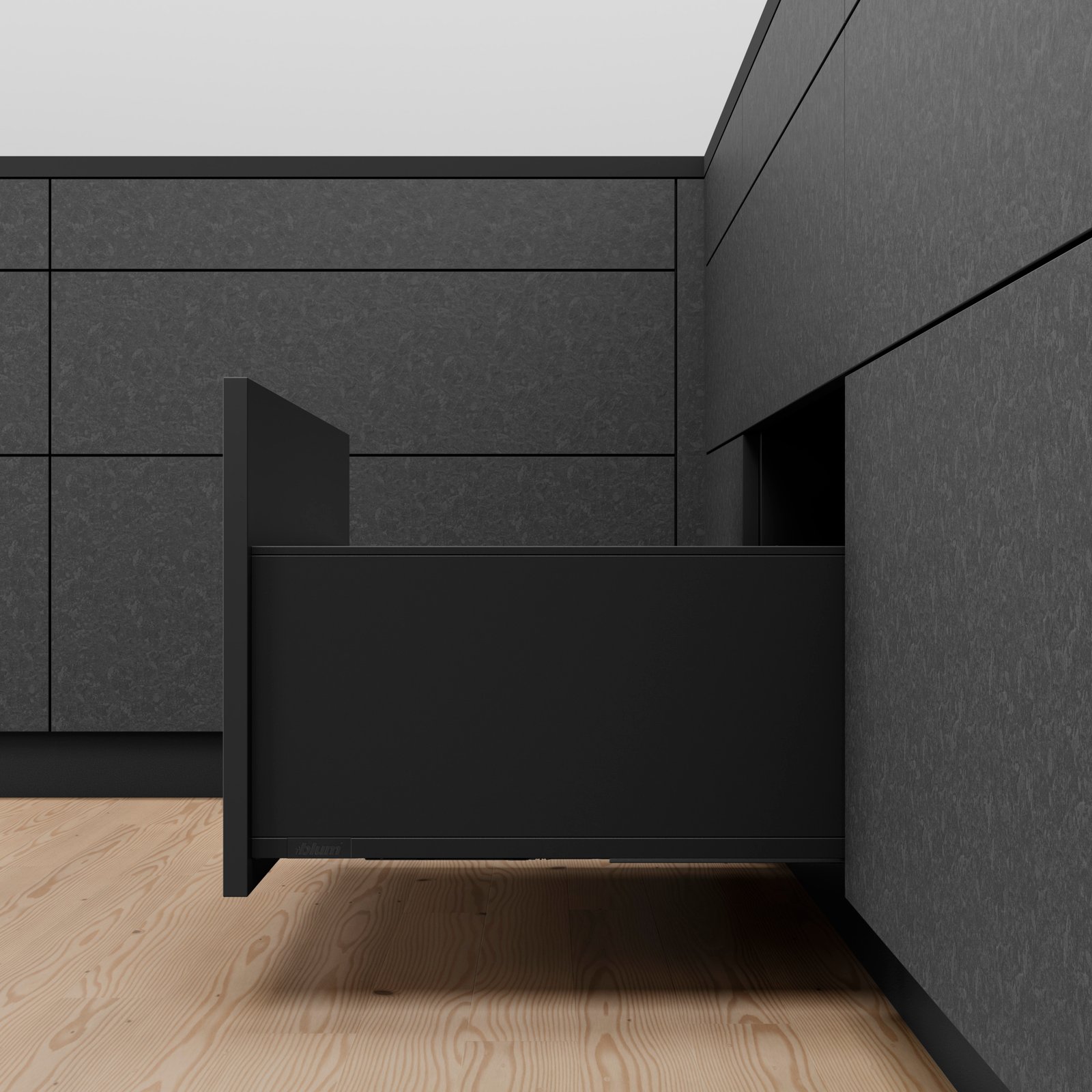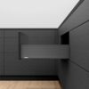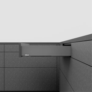 Sistemi LEGRABOX F përdor anësore prej çeliku të fortë metalik me dizajn të hollë dhe linear, që siguron forcë, jetëgjatësi dhe pamje moderne. Disponohet me përfundime të ndryshme sipas dizajnit të brendshëm, përfshirë çelik anti-fingerprint për rezistencë ndaj shenjave dhe pamje premium. Struktura e anësoreve është e fortë dhe e qëndrueshme për përdorim afatgjatë.