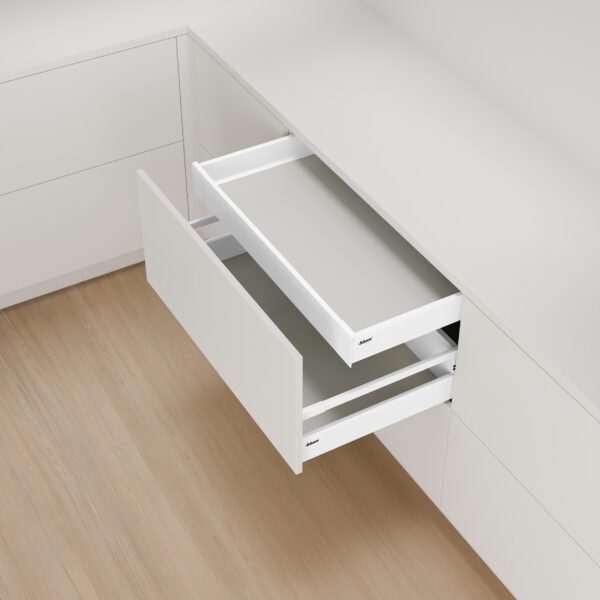 Fioka e brendshme TANDEMBOX M Inner Drawer përfshihet në linjën e sistemit TANDEMBOX dhe ofron dizajn minimalist dhe funksional. Anësoret janë prej çeliku metalik të fortë, duke siguruar stabilitet dhe jetëgjatësi të lartë edhe nën ngarkesa të përditshme. Të gjithë komponentët e plastikës, përfshirë rola cilindrike nylon me fërkim të ulët, janë të koordinuar me ngjyrën e anësoreve për pamje uniforme dhe të rafinuar. Sistemi është i disponueshëm në ngjyrë silk white ose white aluminium (RAL 9006).