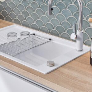 Blanco Elon XL 6 S ky lavaman i integruar i kuzhinës me dizajnin e tij kompakt është një zgjedhje e përsosur si një zonë e vogël kuzhine dhe një zonë e mesme kuzhine. Blanco ELON XL 6 S ka një tas të gjerë dhe të madh me një lavaman dhe një zonë shpikëse kullimi. Zona e kullimit të këtij lavamani të integruar të kuzhinës është e zgjerueshme për shkak të rrjetës së tij të kullimit prej stainless steel. Ky lavaman i integruar i kuzhinës është i disponueshëm në nëntë ngjyra tërheqëse nga e bardha në alu metalike. Blanco ELON XL 6 S përfshin një pajisje mbetjesh me një tub që kursen hapësirë dhe një mbeturinë kërcyese 3 1/2″ për tasin kryesor. Ky lavaman kuzhine silgranit ka gjerësinë e kabinetit 60 cm dhe madhësinë e prerë 760x490xR15. Thellësia e pjesës kryesore tasi është 190 mm dhe ky lavaman mund të pozicionohet në mënyrë të kthyeshme.