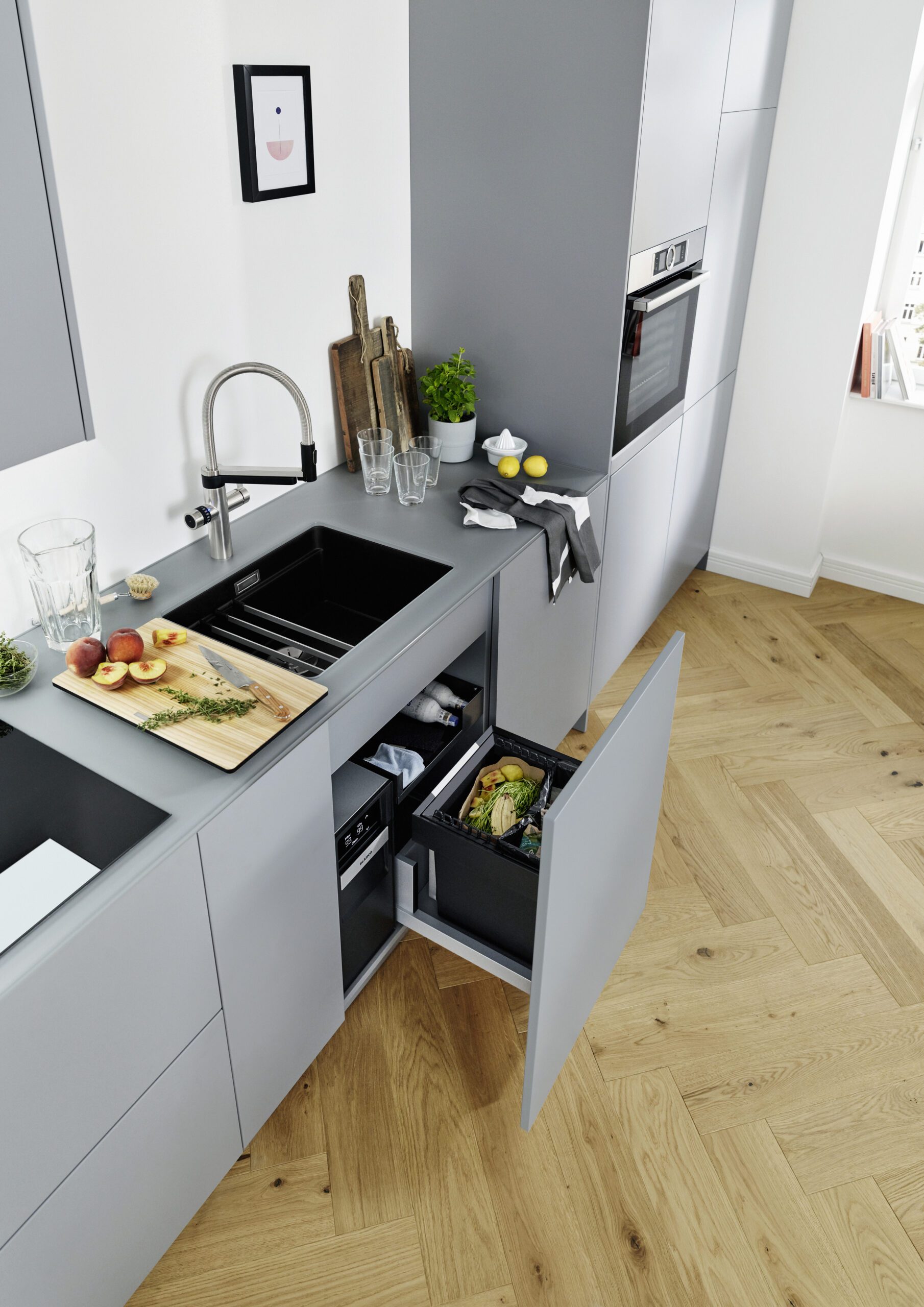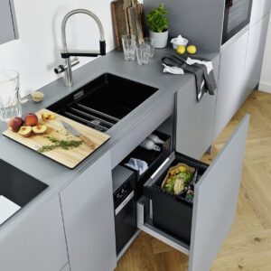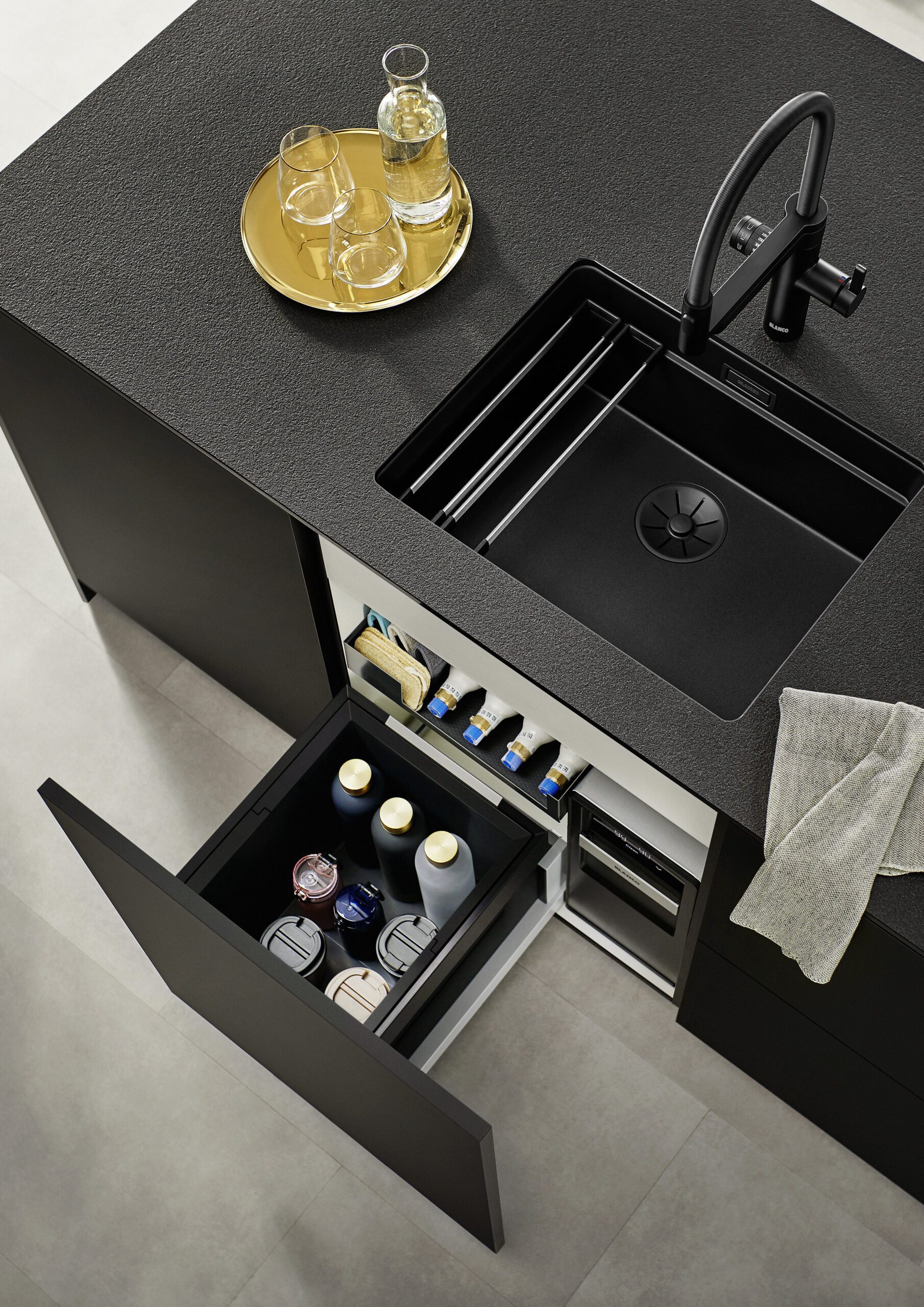 Nëse po planifikoni dollapët e kuzhinës tuaj me një tërheqje përpara, tashmë keni në mendje një përdorim të arsyeshëm të hapësirës. Me BLANCO SELECT II ju mund të përdorni në mënyrë optimale hapësirën e ruajtjes në kabinetin e lavamanit – dhe jo vetëm për ndarjen e mbetjeve. BLANCO SELECT II siguron një kabinet bazë të pastër dhe mund të pastrohet shpejt dhe lehtë falë sipërfaqes së tij të lehtë për t’u pastruar.