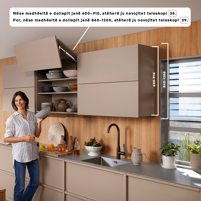 Lartësia e kabinetit të rekomanduar: nga rreth 480 mm deri më 1040 mm — kjo mbulon një gamë të gjerë të kabineteve të murit të kuzhinës apo mobiljeve të tjera të ngritura.