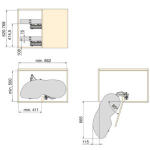 I projektuar për module me gjerësi minimale 862 mm, thellësi minimale 500 mm dhe lartësi të rregullueshme nga 700 në 800 mm. I përshtatshëm për panele me trashësi 16, 18 ose 19 mm.