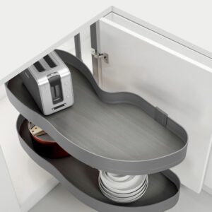 Sistem tërheqës për kënd me soft close për kabinete kuzhine, i dizajnuar për ruajtjen dhe akses të lehtë të enëve, ushqimeve ose pajisjeve të vogla.