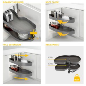 Përbëhet nga dy tray të pavarura me lartësi të rregullueshme, secila me kapacitet ngarkese 20 kg (2 x 20 kg), ideal për shfrytëzimin maksimal të hapësirës në mobiljet e kuzhinës.