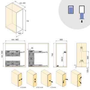 E projektuar për module me gjerësi 300 mm dhe lartësi 700 mm, me thellësi minimale 460 mm. E përshtatshme për panele me trashësi 16, 18 ose 19 mm. Instalimi është i lehtë duke përdorur shabllonin dhe vidat e përfshira.