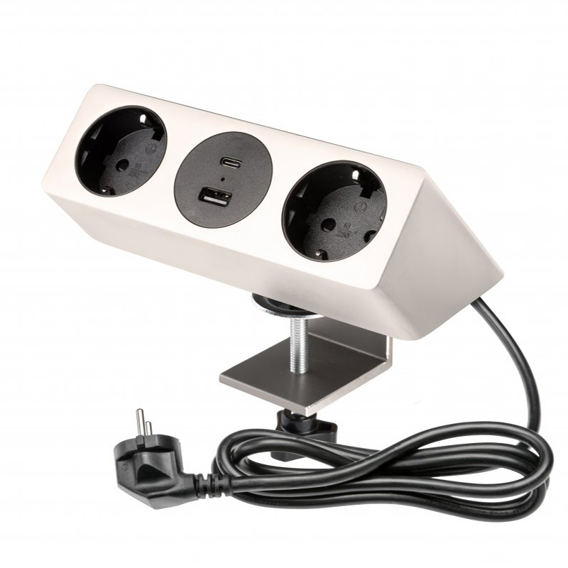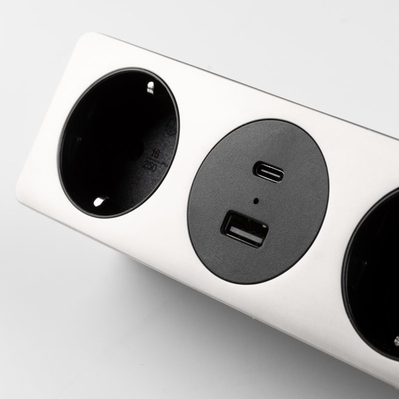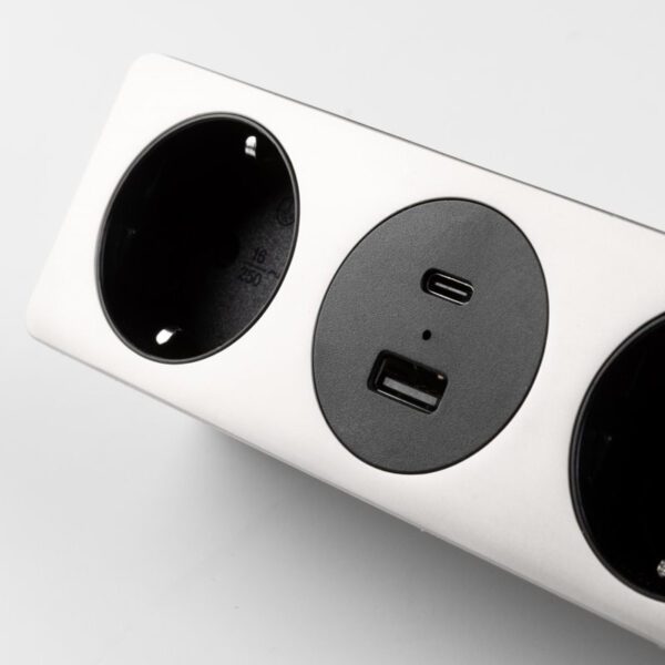 Priza është e pajisur me karikues USB A+C Fast Charge 30W, që ju lejon të karikoni shpejt dhe komodisht të gjitha pajisjet tuaja. Instalimi i kabllit të zgjatjes është jashtëzakonisht i thjeshtë – mjafton një rrotullim për ta montuar fort në tavolinën e përfunduar, pa nevojën për të bërë vrima.