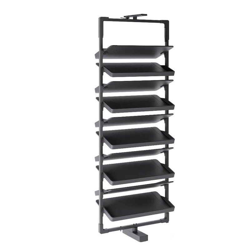 Raft rrotullues për këpucë, i dizajnuar për organizim maksimal dhe shfrytëzim praktik të hapësirës. I disponueshëm me dhjetë rafte, ky sistem ofron kapacitet të lartë për ruajtjen e këpucëve duke i mbajtur ato gjithmonë të rregulluara dhe lehtësisht të aksesueshme. Raftet janë të veshura me lëkurë të zezë cilësore, e cila i jep produktit një pamje elegante dhe moderne, njëkohësisht duke siguruar qëndrueshmëri dhe mbrojtje për këpucët. Mekanizmi rrotullues mundëson përdorim të lehtë dhe komod, duke e bërë këtë raft zgjidhje ideale për garderoba, dhoma veshjeje apo ambiente bashkëkohore që kërkojnë funksionalitet dhe estetikë në një produkt të vetëm.