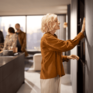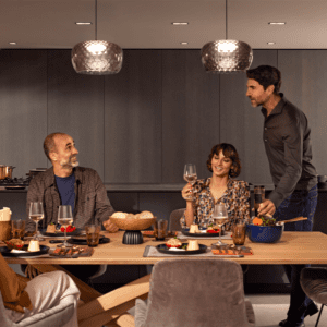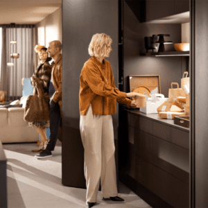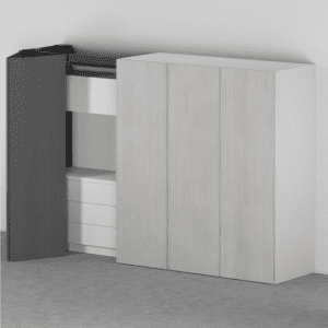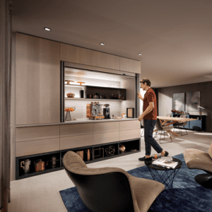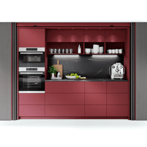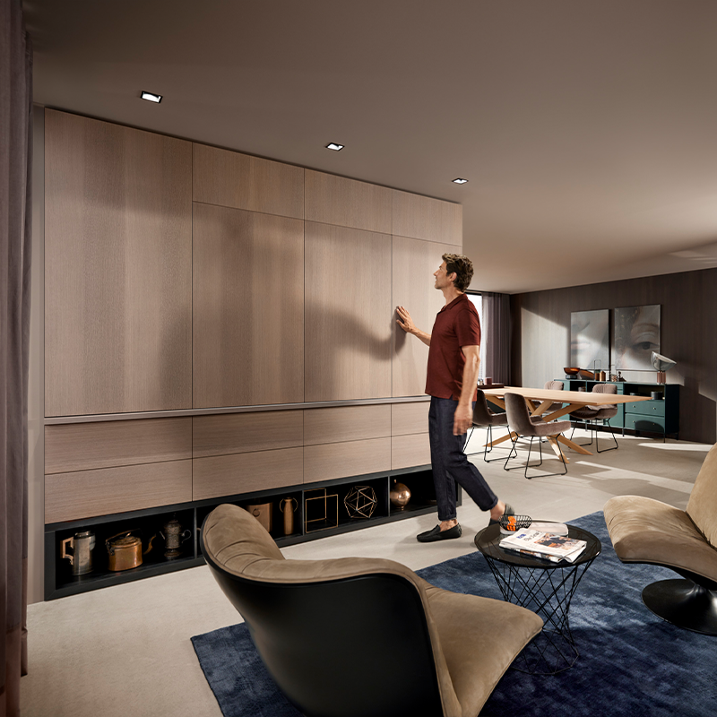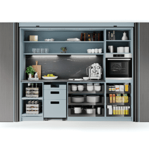REVEGO është një sistem inovativ “pocket” nga Blum, i projektuar për të fshehur dyer ose fronte të mëdha mobiljesh brenda një xhepi të integruar anësor. Ky sistem lejon që hapësirat e brendshme, si kuzhina, zona e punës, garderoba apo dhoma e ndenjes, të hapen plotësisht kur nevojiten dhe të mbyllen në mënyrë elegante kur nuk përdoren, duke krijuar një pamje të pastër dhe minimaliste.