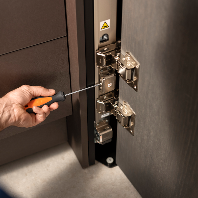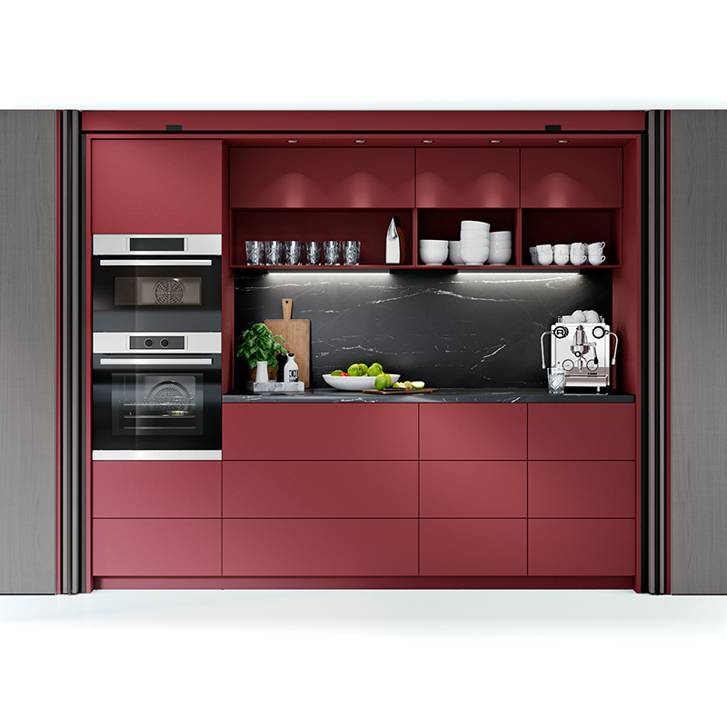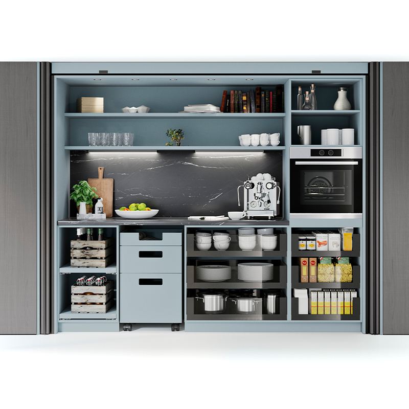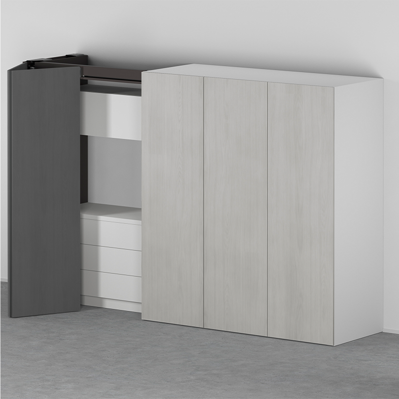 Xhepi i sistemit është i projektuar që të fshehë plotësisht frontet kur ato hapen, duke mos penguar aksesin në hapësirën e brendshme. Mekanizmi është i fortë dhe i besueshëm, i përshtatshëm për fronte të mëdha dhe përdorim të përditshëm. Kur dyert mbyllen, sistemi siguron pozicionim të saktë dhe një vijë të drejtë frontale, pa hapësira të padëshiruara.