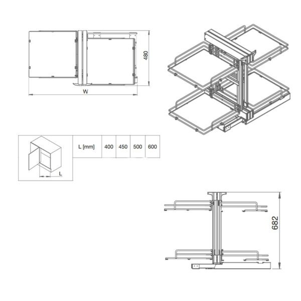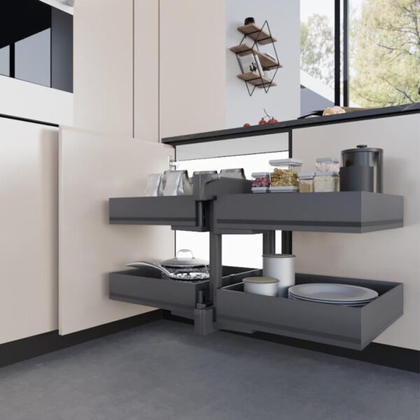 Mekanizëm i kthyeshëm për bazën e kuzhinës me nxjerrje totale. Me metal të lyer me kosha komplete në alumin të kuti dhe të lyer. E disponueshme në disa përfundime.