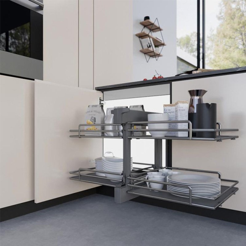 Mekanizmi Compact është një zgjidhje moderne për organizimin e dollapëve qoshe të kuzhinës. Ai ofron ndarje tërësisht tërheqëse, të cilat mundësojnë qasje të lehtë dhe maksimale në çdo produkt të ruajtur.