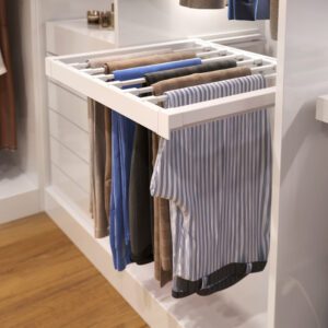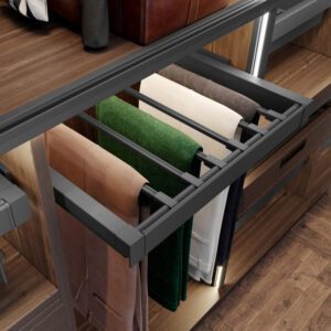 Sirtari ELITE me varëse ofron hapësirë ruajtëse për pantallona. Është jashtëzakonisht praktik falë ndarjeve të shumta. Teknologjia soft-close dhe nxjerrja e plotë e bëjnë sirtarin të lehtë dhe funksional për përdorim të përditshëm.